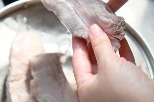鍋にたっぷりの湯を沸かし、スペアリブを入れて沸騰したらすぐにザルに上げます。流水で余分な脂や汚れを洗い流しましょう。このひと手間で、肉の臭みが抜けて脂っぽさも軽減し、スープがすっきりした味わいに仕上がります。