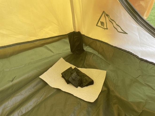 さらに、100円ショップなどで購入できる結露吸水テープや、再利用できる除湿シートを活用することも有効だ。未使用の炭をテント内に置くだけでも湿度対策として頼もしい働きをしてくれる。これらを組み合わせることで、“びちょびちょ地獄”はかなり予防できる。