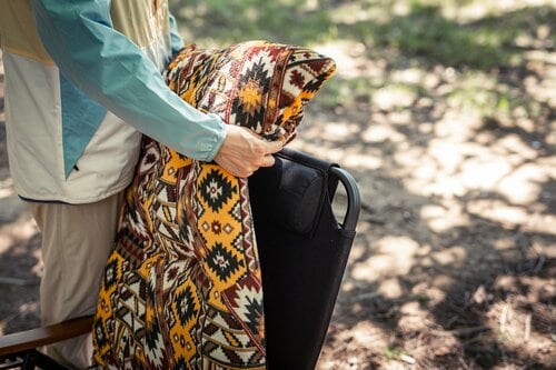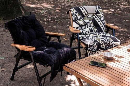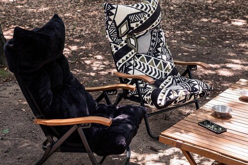 こちらのモデルも、同様に焚き火の近くでも使用OK。中綿入りで厚みは最大8.5cmでとっても肉厚です。ふかふかで外でもゆったりとくつろげます。もちろん、保温性も高くなっています。