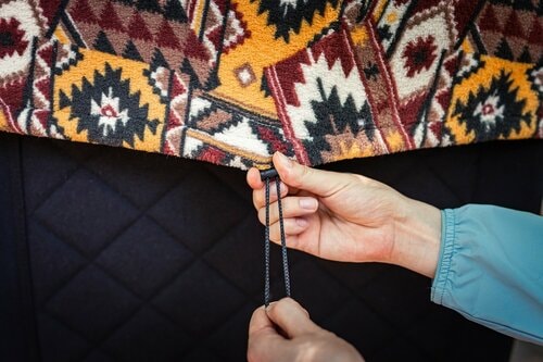 足元にはポケットがついていて、スマートフォンなどの小物を入れておくことができます。ちょうど、ふくらはぎ付近に位置しているので、風除けにもなります。