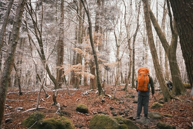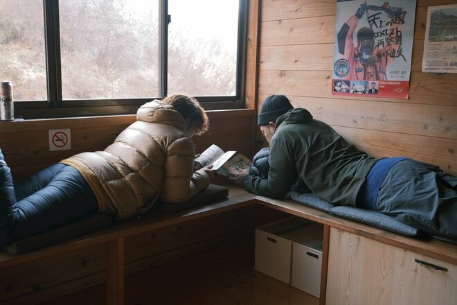 この日(2024年2月)の早朝の気温は0℃。筆者は重量との兼ね合いで夏用シュラフに上下ダウンを着用し、ナルゲンボトルを湯たんぽとして使用。また、ロールマットに100円ショップの銀マットを組み合わせて底冷え対策とした。睡眠はとれたが、朝晩は冷え込んで強い寒さを感じた。年によっては降雪があったり、氷点下になることもあるため防寒対策は必須だ。状況によって山荘宿泊を選択するのもいいだろう。