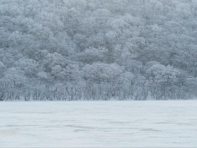 小沼のアイスバブルは、近ければ駐車場から歩いて5分程度の場所でも見つけられる可能性もある。運次第のところもあるが、短時間で“氷の芸術”を楽しめるのでぜひチャレンジしてほしい。なお、アイスバブルを堪能した後は、ゆっくり湖畔でのスノーハイクもいいだろう。富士山の撮影スポットもあり、小沼と霧氷、富士山の冬景色も楽しめる。
