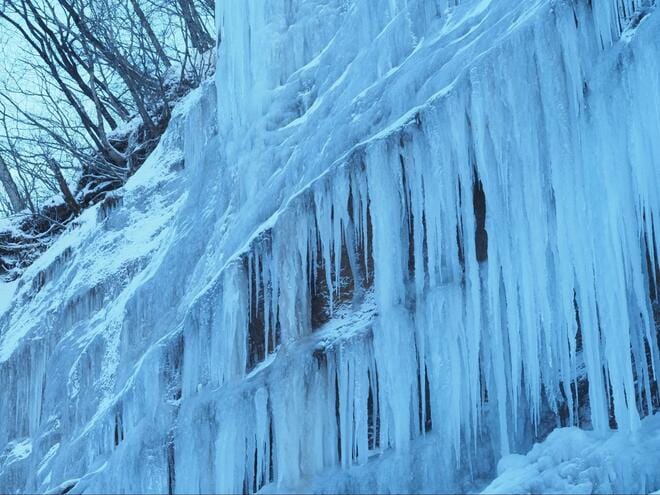 ■「青白い氷の造形美」 凍てつく大自然のアート「小滝の氷瀑」