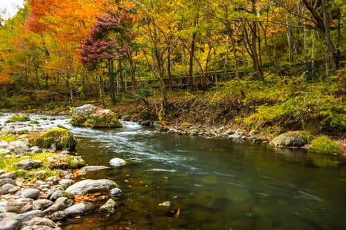事務所でアドバイスしてもらった、ドライでの反応がいいらしい“トンネル前の瀬”へ。フックサイズ#15程度の黒いアブ・ハエのようなフライを流すと、するどく魚が飛び出しました。しばらく抵抗した後、下流へ向かって一気に走ろうとするのをなんとか制止しつつ、徐々に手元に寄せてネットイン。あたりを彩る紅葉に染まったかのようなニジマスでした。