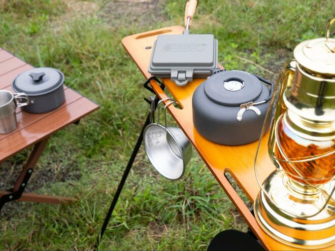 充実したキャンプギアで常に注目を集めるDAISO(以下、ダイソー)の中でも、特に話題になったのが「ハンギングラック(収納ポーチ付き)」と「ハンギングラック用ウッド天板」である。