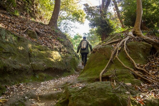 続いてコースは、苔むした岩の間を抜けたりしながら、アップダウンのある登山道へと入っていく。木の根がむき出しになった箇所や狭い道、ぬかるんで滑りやすい場所もあるので注意して進んでいく。ところどころ、やぐら跡のような史跡も見られ、鎌倉の歴史を感じることもできる山道だ。