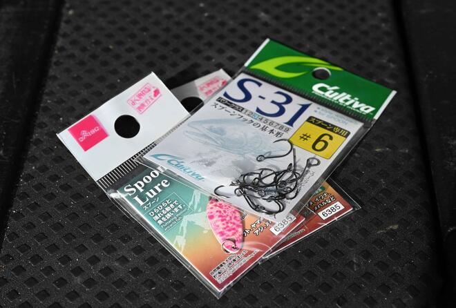 購入したスプーンにセットされていたフックは#4くらいで、マハゼの口には少し大きく感じたので、カルティバのスプーン専用フック「S-31」#6に交換し、そこに岩イソメを小さく付ける、いわば “ルアー+エサ” の折衷釣法を試みた。