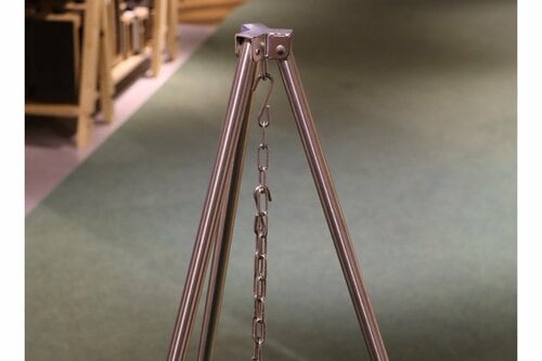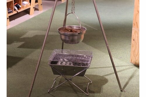 そこで、加藤さんがおすすめするのが、IGNIO(以下、イグニオ)の「トライポット」です。これは焚き火用のスタンドで、いつもの焚き火をちょっとバージョンアップしてくれるアイテムなのです。
