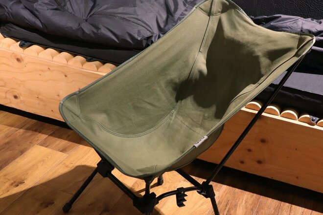 食事が済んで、ちょっとくつろぎたいなと思ったら、後ろ側の脚を短くすれば、空を見上げるような角度にでき、のんびりと過ごせます。「そして、4本の脚をすべて折り畳んでしまえば、座椅子のようになるので、これもまた焚き火にぴったりです!」(加藤さん)