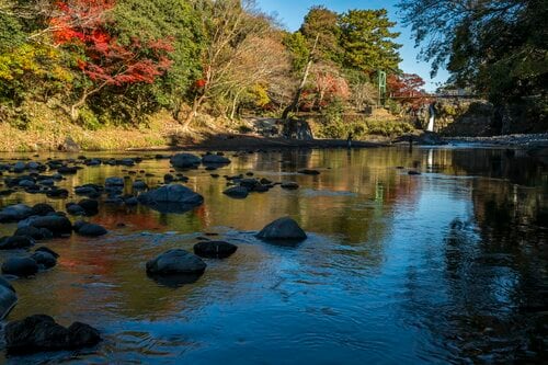 「裾野市中央公園」の駐車場に車を停めて、園内を足早に移動して黄瀬川の畔へと降ります。ここは五竜の滝のすぐ下流、まだ残る紅葉が晩秋の景色にひときわ鮮やかな彩りを添えていて美しい。