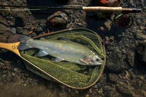 力強くラインを引き、激しく抵抗するニジマスは先ほどまでの魚よりずっと大きいです。手前の流れの濁りのなかに招き入れ、視界に筆者が入らないように岸際まで寄せてきてネットのなかへ。極太のニジマスで陽光に燦々と煌めく魚体は健康的で透明感がありました。