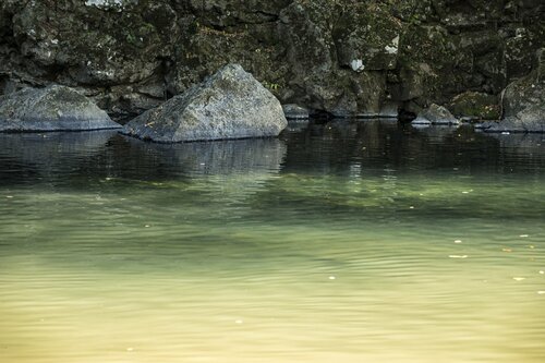 昼近くになると、徐々に濁りが混ざってきました。五竜の滝すぐ下流で合流する支流が濁っています。それでも、合流点に近いプールの対岸(左岸)は濁らずに透明度を保っていました。流れに揺れるニジマスたちを眺めながら、微妙に立ち位置を変えながらフライを流し続けます。