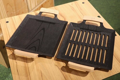 丸形はいまや定番的な存在ですが、ここで紹介する2モデルは27cm×26cmのスクエアタイプ。炒め物や焼きそばなどにぴったりの「アルミグリドルプレート26」と、焼き肉やステーキ向けの「アルミスリットプレート26」の2製品で、いずれもアルペンアウトドアーズの新作です。「1~2人分の調理にちょうどいいサイズで、軽くてとても扱いやすいです」(加藤さん)