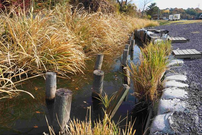 幅2〜3mほどの水路状の釣り場には乱杭が点在し、岸辺にはアシが揺れるなど、管理釣り場ながら自然の水辺に近い風情を味わえるのが特徴である。