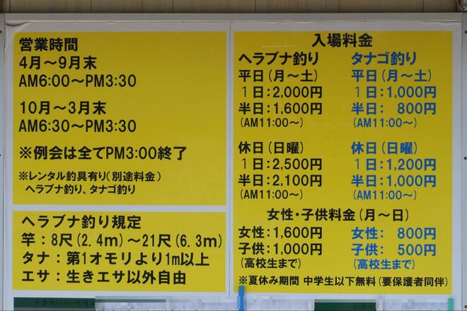 釣り場は都心から車で約90分とアクセスがよく、元旦(1月1日)を除き年中無休で営業している。休日の遊漁料は1,200円(平日は1,000円)と手頃で、女性や子ども向けの料金に加え、半日券(午前11時〜)も用意されている。
