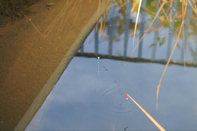 今回、筆者が使用した仕掛けは、親ウキの下に視認性のよい6個の糸ウキを連ねた連動シモリウキ仕掛けである。春から秋の活性が高い時期であれば、水中の糸ウキはもちろん、水面の親ウキもピクピクと大きく反応する。しかし冬のタナゴはエサをくわえても糸ウキだけが横へ微かに揺れる程度である。瞬きする一瞬でも見逃してしまうため、ウキの動きに集中し続ける必要がある。