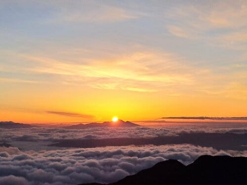 翌朝も天気はよく、朝食後のご来光も見事で八ヶ岳から綺麗に昇ってきた。織りなす光が美しい。下山は登山者も多く、ゆったりしたペースで昨日の疲れが残る脚でひたすら歩く。