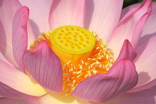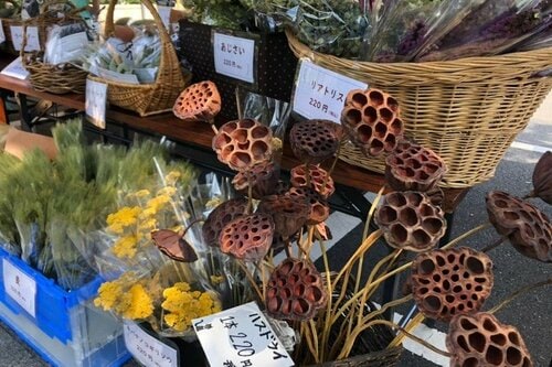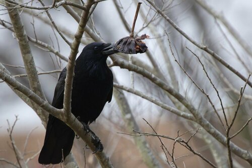 同じ公園での話です。今度は、カラス(ハシボソガラス)が、ハスの「花托(かたく)」をくわえて飛んできました。「花托」とは、ハスの花の中心部のことです。花が咲いているときは色も形もおいしそうなプリンのようです。それが熟すと、めしべ(花托の中に見えるつぶつぶ)の子房が、実となります。枯れて乾燥した花托は、ハチの巣のような美しさがあり、クラフトの材料やインテリアとして人気があります。