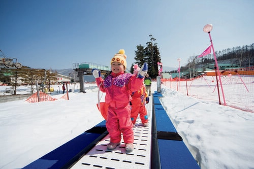 スノーエスカレーター完備のキッズ専用ゲレンデ「ロックン広場」では、そりやチュービング、エア遊具やスノーストライダーなど、滑って、跳ねて、笑って、思い切り雪とふれあえるエリアだ。スキー場内には託児所、授乳室もあり安心。