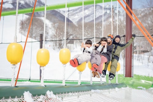 雪遊びパーク「白馬つがいけSNOWアクティビティWOW!」では、定番のソリから、ソリにハンドルとブレーキがついたスノーレーサー、スケートボード感覚のスノースケートなど、多彩なアクティビティが楽しめる。5人乗り雪上バギーや、飛び跳ねて遊ぶアミダスなど、ノンスキーヤーでも楽しめるアイテムも充実。