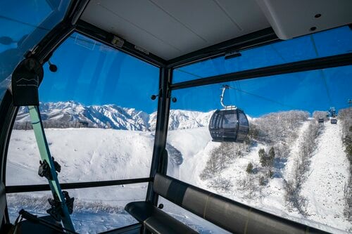 準備をしたらゴンドラに乗り込んで山頂エリアへ。昨シーズン、旧ゴンドラに変わって新設された10人乗りの大型搬器は、広く開放的な室内空間となっています。4面に強化ガラスを使用しており、スキーやスノーボードも一緒に中へ持ち込むことが可能です。