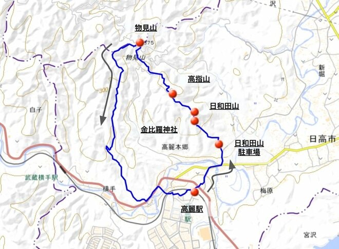 高麗駅 (0:00) → 日和田山駐車場 (0:15) → 金比羅神社 (0:45) → 日和田山 (0:55) →高指山 (1:25) → 物見山 (2:00) → 高麗駅 (3:20)