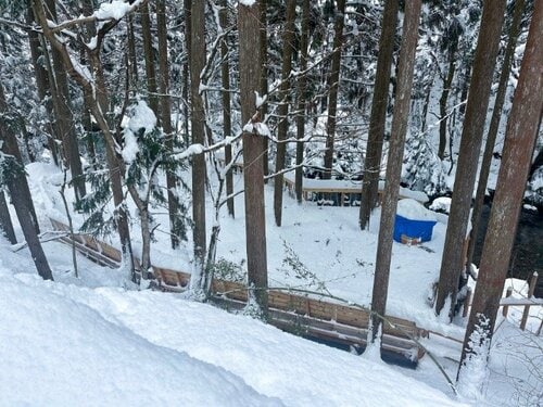 数日後、ようやく雪をかき分けてツリーテラスに辿り着いたとき、言葉を失った。補強前だったツリーテラスは、50cmほど積もって固まった雪の重みで傾いていた。この時の悲壮感はなかなかのものだった。