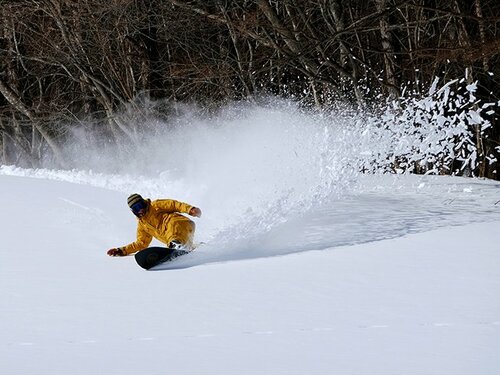 「オグナほたかスキー場」には、尾根や沢などの自然地形を利用した変化に富んだコースが13本。天然雪を存分に味わえるワイドな非圧雪ゲレンデが豊富に揃い、吹き溜まって深さのあるパウダースノーも味わえる。新雪やコブが楽しめる全面非圧雪の「ウェーデルンコース」や、圧雪バーンと非圧雪のどちらも味わえる「スラロームコース」などさまざまな楽しみ方ができるのがユニークだ。
