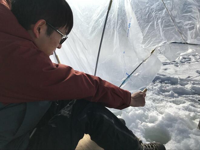旅館のスタッフに簡単なレクチャーを受けたのち、自分たちで場所を決め、釣り用の穴を掘る。そこに簡易テントを張り、釣り場とする。もちろんかなりの寒さだが、防寒着を着込み、テントが風を防いでくれるので過ごしやすい。温かいコーヒーを飲むなどしながら、3時間ほどのんびりと釣りを楽しんだ。
