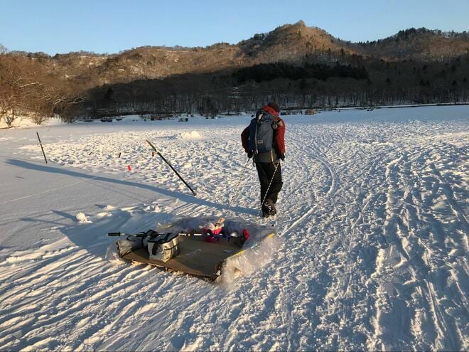 赤城大沼は群馬県前橋市にある赤城山の山頂付近に位置する。東京都内から新幹線やJR在来線で前橋駅へ。前橋駅からはバスに乗り1時間20分ほどでアクセスできるため、車がなくても訪れることが可能だ。筆者の場合は2月上旬、赤城大沼そばにある旅館「青木旅館」に前日から宿泊し、朝7時前に徒歩で釣りへ向かった。釣り道具や簡易テントなどは宿でレンタルできるため、手ぶらでチャレンジすることもできる。