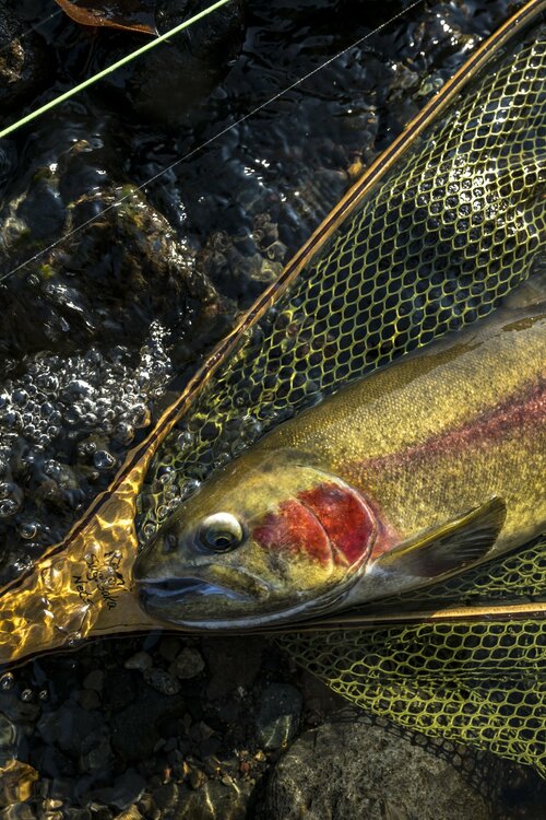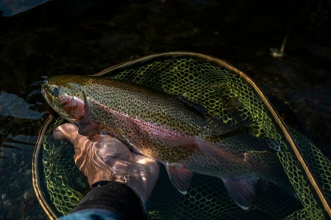 しかし、ひょっとしたら“竿抜け”かもしれません。良型が素直に反応しそうだと思い、そこを狙うことにしました。流れに馴染ませながら、水面直下にソフトハックル(フライの一種)を流し込むと、水中で身を翻すニジマスの姿が見えました。妙に色鮮やかな魚体が朝日に輝いています。ネットインしたモーニングレインボーが、恨めしそうに睨んでいます。幸先のいいスタートを切ることができました。