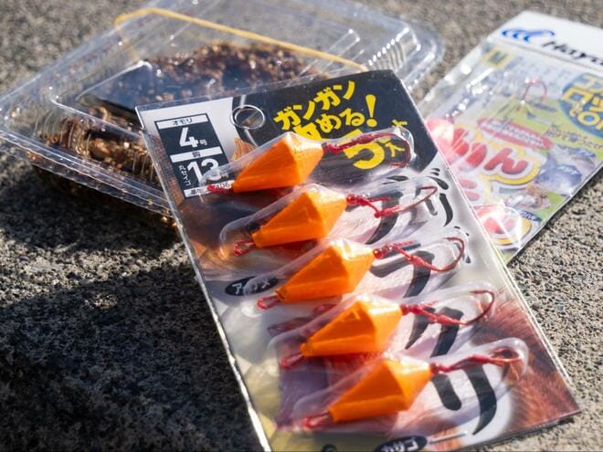 ルアーのライトゲームと非常に相性のよいカサゴ。初心者におすすめなのが、オモリと針が一体化したジグヘッドにワームをセットした“ジグヘッドリグ”で消波ブロックや岩の隙間を狙っていく方法だ。操作はシンプルで、まずボトム(底)をとり、その後ゆっくりと引いてくるだけだ。