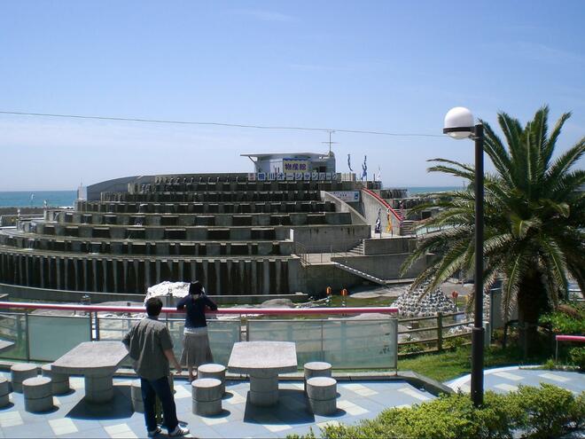 本館のそばにある海を望む公園「漁民公園」には無料で利用できる足湯コーナーがある。施設は小さめだが、湯は里山の川岸より自然湧出し、ほのかに硫黄が香る「鴨川温泉 なぎさの湯」の温泉を使用。レジャーや散策で疲れた足を気軽に癒すことができるスポットだ。