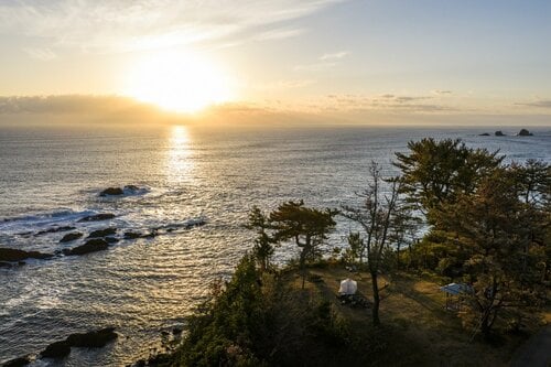 空がわずかに白み始めた頃に目を覚ますと、早朝だけあって空気は冷たい。湯を沸かし、自分はコーヒー、息子はココアを手に、それぞれ椅子に腰掛けて水平線の彼方を静かに眺める。