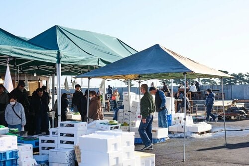 我々は夜中に関東を出発し、常磐道をひたすら北上。まずは、「ゆりあげ港朝市」に立ち寄った。この朝市は、30年前から毎週日曜日と祝日に開かれている。多い日には1日で1万人以上も訪れるという、仙台を代表する観光スポットである。