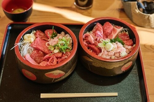 筆者は市場内にある一軒で「マグロづくし丼」を注文した。値段は1,300円。よくある見た目だけ立派で観光客向けの高額な海鮮丼とは違い、ネタの鮮度は抜群。しっかりと“港町の朝市”らしい一杯だった。