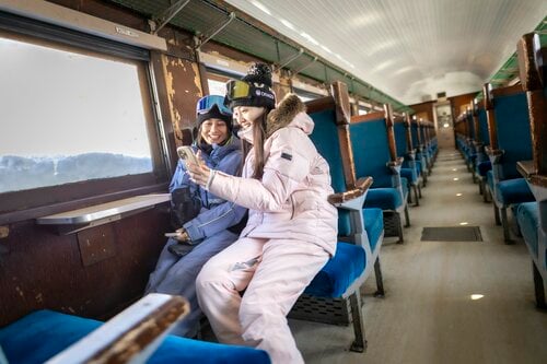 スキー場内に無料休憩所が6か所あるということもこのスキー場のいいところ。なかでもユニークなのが、ゲレンデベースにある「ブルートレイン・中里」だろう。実際に使われていた列車をそのまま再利用したもので、当時の車内の雰囲気がそのまま残ったスペースもある。