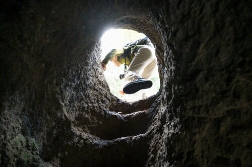 観音堂へは、岩壁をぐるりと回り込み、急な階段を使ってアクセスします。全長17mの梯子もかけられていますが、現在は老朽化により使用禁止。以前は、この梯子を登って参拝していたそうなので、恐ろしいですね……。観音堂から下を覗くだけで、股のあたりがスースーします。