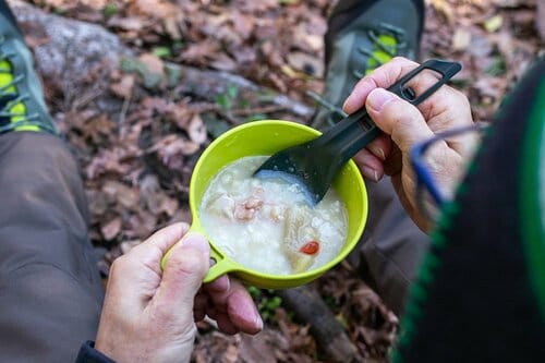ところで、このサムゲタンは160g(1人前)の量が入っている。汁気の量は十分あるけれど、これ1品では炭水化物が足りない気がするので、持参してきたおむすびを投入して食べることにした。これから始まる1日のために、エネルギーの元になる炭水化物をたくさん摂ろうという魂胆であります。