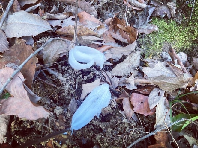 冬の冷え込んだ森で足元をみてみると、白いかわいい花が咲いていた。この花はシソ科の「シモバシラ」という多年草であり、冬になると地上部は枯れてしまうが、根から吸い上げられた水分が地上部の枯れた茎から染み出して氷点下の外気に触れて氷の結晶となる。それがいくつもの層になったのが「氷の花」だ。筆者が初めてシモバシラの花に出会ったのも、ここ仏果山だ。