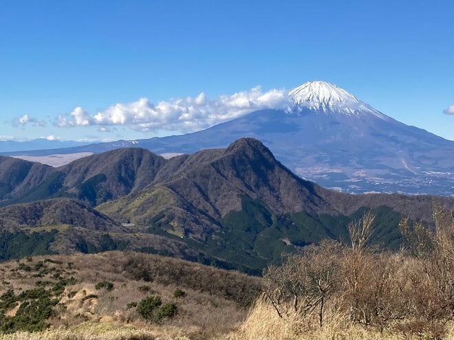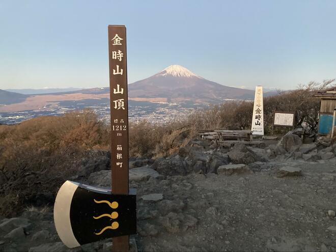 金時山は日本三百名山に名を連ね、箱根をぐるりと囲む外輪山の最高峰だ。山頂からは箱根や芦ノ湖を一望できるだけでなく、富士山の景色も楽しむことができる。富士山までの間に視界をさえぎる山がないため、麓から富士山山頂までを望むことができ迫力満点だ。