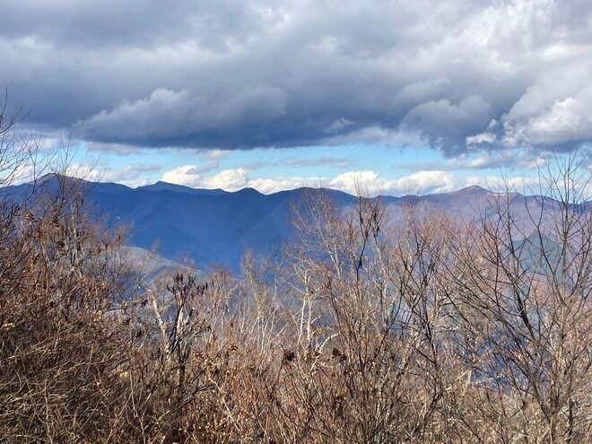晴れていれば山頂からは富士山を望めるほか、奥多摩秩父の山々の景色を楽しむことができる。樹林帯の中にある山頂はグリーンシーズンは木々の葉が生い茂るため眺望が限られてしまうが、冬枯れし、葉を落とすと眺望を楽しめる。三頭山の三つのピークからは違った景色を見られるため、ぜひ異なる眺望を楽しみながら周回してほしい。