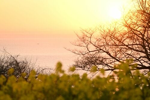 南に視線を移すと、相模湾がどこまでも広がっています。緩やかな曲線美を描く湘南と菜の花のコラボレーションは、いつまで見ていても飽きることはありませんでした。