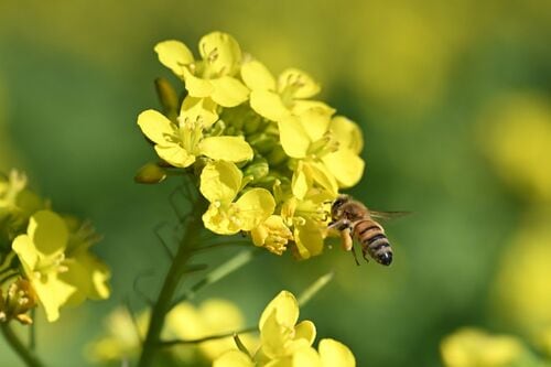 また、スズメの小さな群れも時折現れ、花や昆虫をついばむ様子もうかがえました。普段は「なんだ、スズメか」と関心を寄せることが少ない人たちも、菜の花の上に乗ったキュートなスズメは特別な存在のようで、熱心にスマホを向けていました。