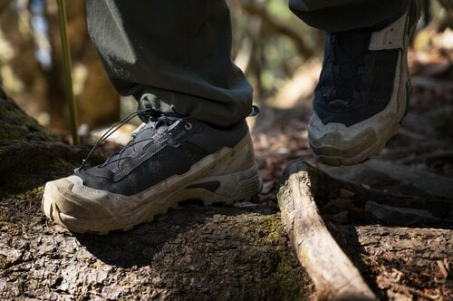 その理由のひとつが、ミッドソールに内蔵した土踏まずの両サイドをホールドするような形の「アドバンスドシャーシ」と呼ばれる構造です。不安定なトレイルでも足の横ブレを防ぎ、捻挫などのトラブルを未然に防いでくれる優れもので、実際にローカットながら足がホールドされている安心感があり、岩場でも足の置き場が決まりやすいのが印象的でした。