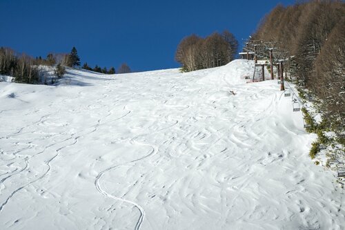 スキー場のメイン玄関口はゲレンデ中腹にある「やまぼうし駐車場」。駐車場前の道路を渡ると「レストハウスやまぼうし」があり、その目の前からコースに滑り込める。この日は早い時間にスキー場に着いたので、「朝イチのピステンをいただき!」とレストハウス前の「パラダイスコース」にさっそく滑り込む。しっかり整備されていて、足元から伝わる雪のやわらかさが心地いい。リフト乗り場近くまで滑り降り、山の方を振り向くと雪に覆われた乗鞍岳が朝日に輝いている。「清々しいファーストランができた」と滑り出しから気分上々だ。