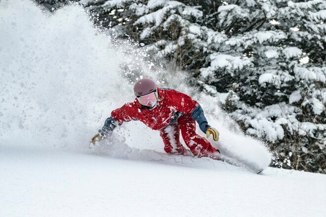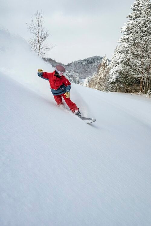 まずはお目当てのパウダースノーを味わいます。気持ちよくスプレー(雪煙)を上げながらの滑走は底付きもなく快適そのもので、筆者にとって今シーズン一番のパウダーライディングとなりました。 この日は間違いなくパウダーデイだったのですが、競争率は明らか低く(とは言っても、何人か知り合いに会いました)、何本もクオリティの高いパウダーライディングを堪能しました。