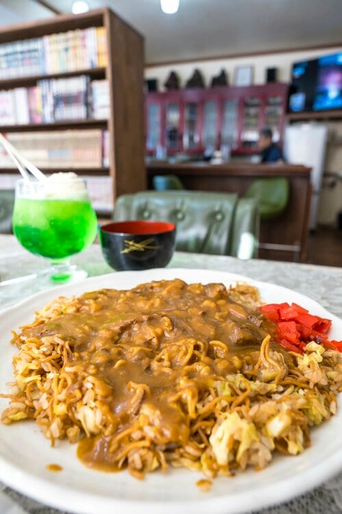 山道を下りきった先、塩谷の交差点の角に目指すランチスポットがあります。長年、地元で愛され続けてきた「くりの木」です。どこか懐かしい雰囲気が漂う店内は、漫画喫茶のように漫画が所狭しと並んでいます。