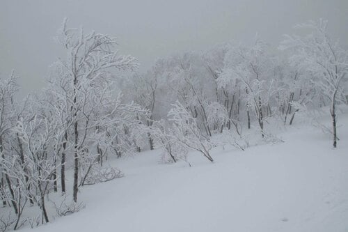 高度を上げていくと、木の枝に雪が積もっていたり、霧氷になっていたりして、見渡す限り砂糖菓子の景色となっていきます。さらに霧が広がってくると、子どものころ読んだおとぎの国の世界に迷い込んだような感じになってきました。