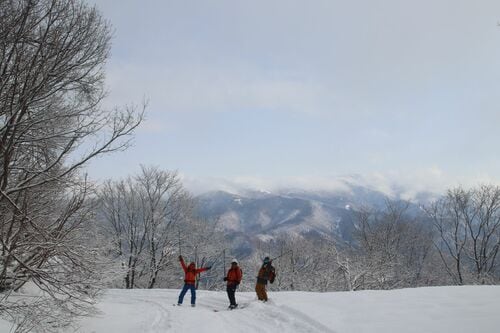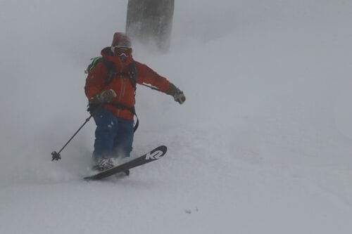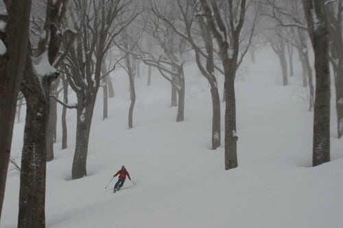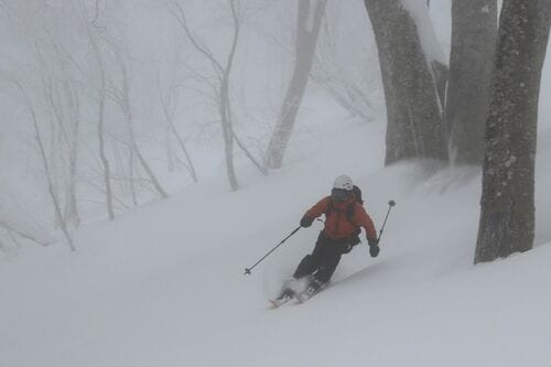 無線の連絡を受けて、ゲストも喜びの雄叫びを上げながら次々とドロップしていきます。筆者の番が来ました。ブナの木は適度な間隔で生えているので、気持ちよく滑走できます。しかも、雪が軽い! これこそ日本が世界に誇る“JAPOW”(ジャパンパウダー)なのでしょう。板がどんどん走っていきます。そのため、テレマークスキーの操作性に課題のある筆者の歓声が悲鳴に変わる瞬間も一度や二度ではありませんでした。それも雪遊びの喜びの一つと、言い訳をしておくことにしましょう。